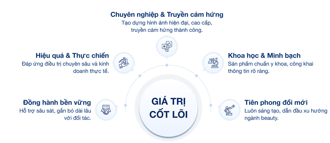 Sứ mệnh: Kiến tạo một hệ sinh thái dược mỹ phẩm chuẩn khoa học, minh bạch và hiện đại; đồng hành cùng các đối tác phát triển bền vững, nâng cao trải nghiệm chăm sóc sắc đẹp và mở rộng cơ hội kinh doanh thành công.